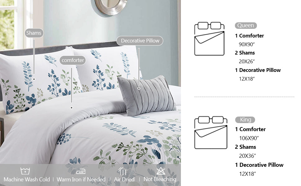 - Comforter Set SIZE:King comforter set includes 1 Comforter (106X90") + 2 Shams(20x36") + 1 Decorative Pillow(12x18")