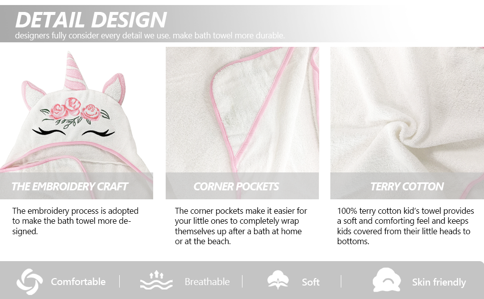 The kids hooded bath towel is made of 100% high quality cotton terry. Safe and healthy material, soft and comfortable touch to provide you and your child with the best experience. The smooth and delicate embroidery pattern adds vitality to the hooded towel for kids.